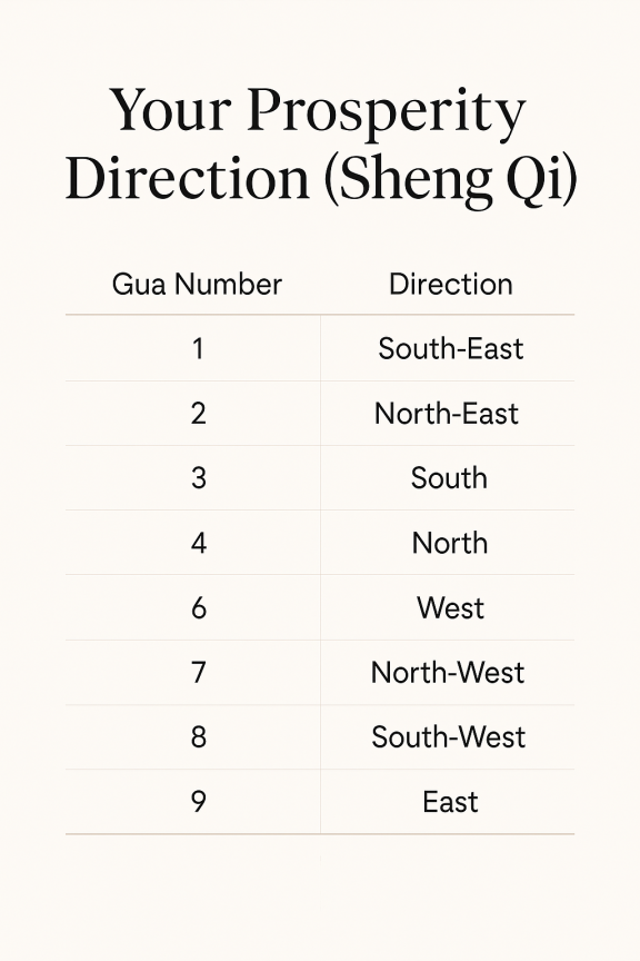 🔹 Step 3: Find your Sheng Qi (Prosperity) direction in the table below.
