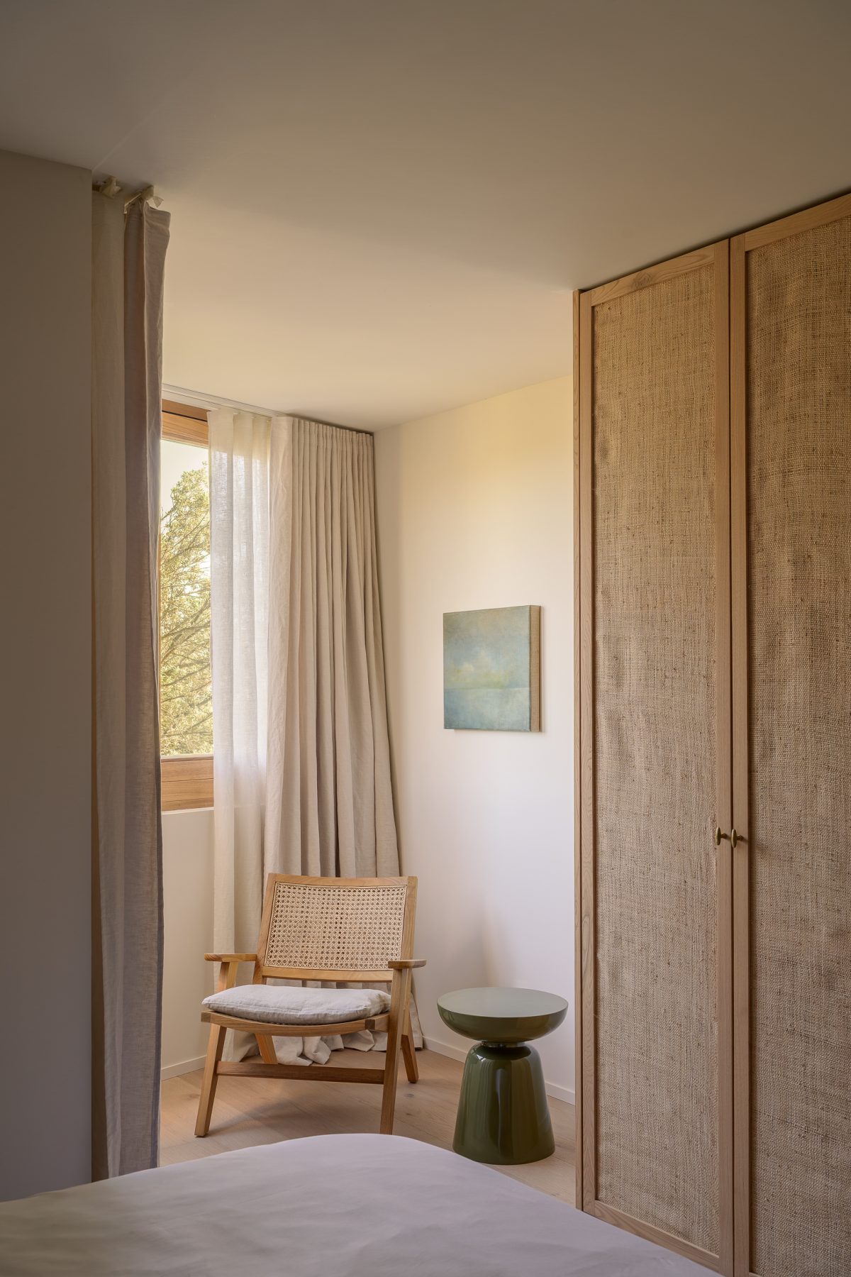 Master bedroom. Cool palette (grays, blues). Soft forms. Natural materials. Bed in command position capturing favorable Star.