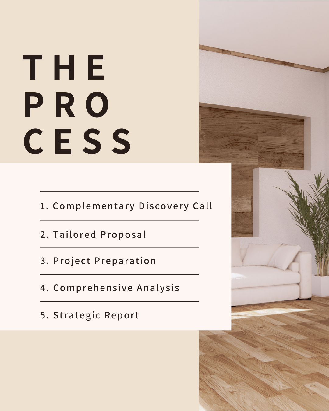 You receive a custom transformation strategy with: specific changes for each room, priority areas for maximum impact, timeline for implementation.